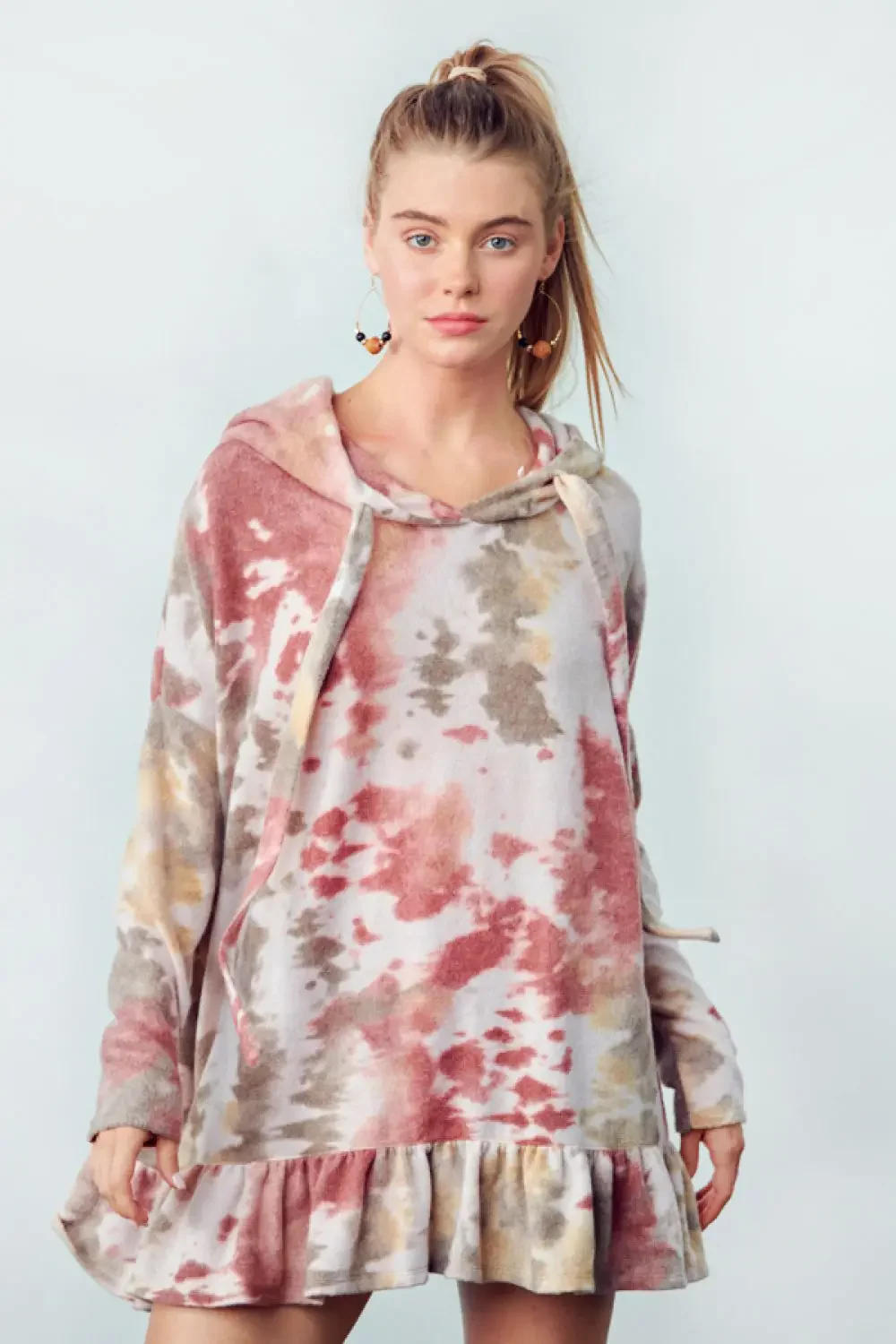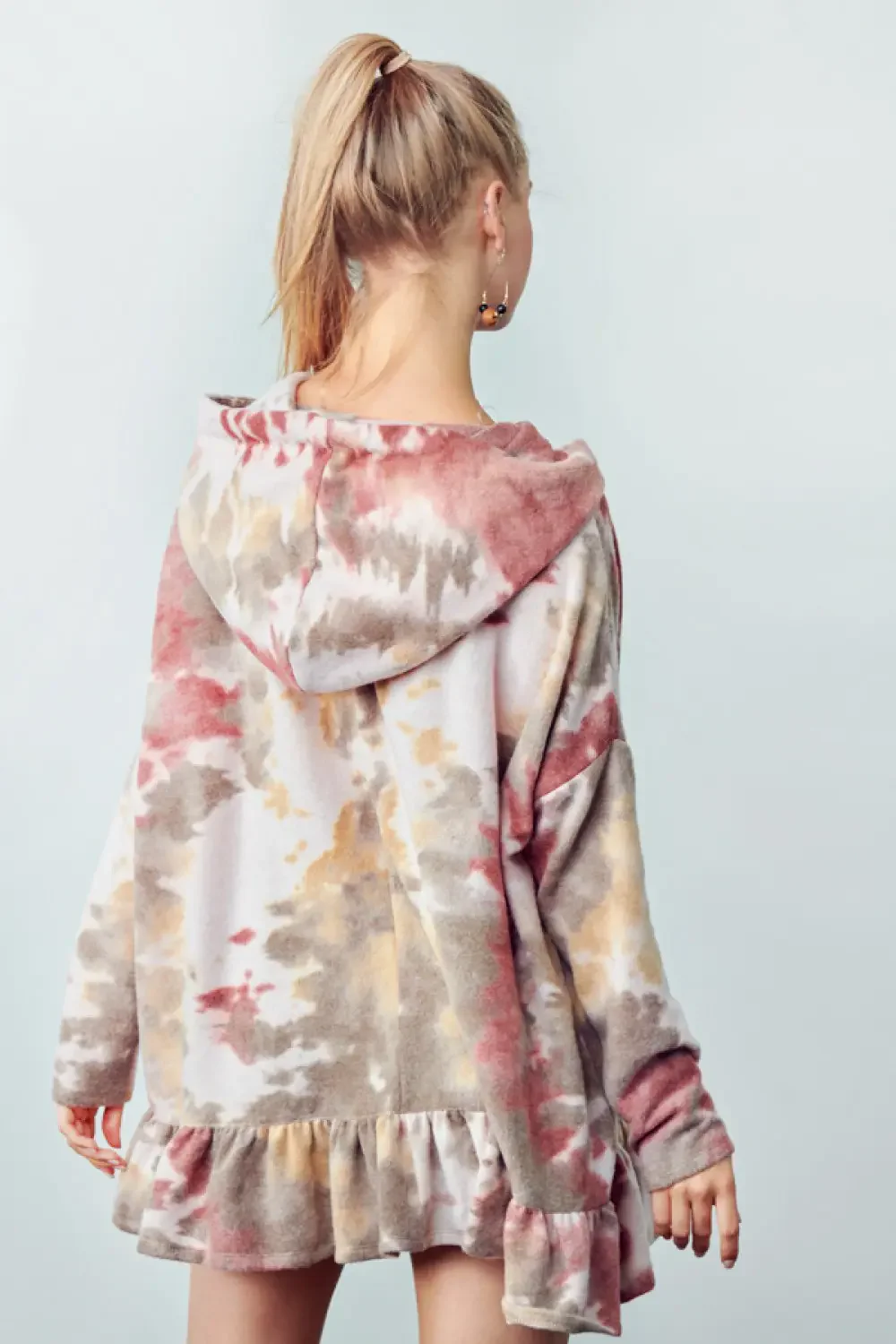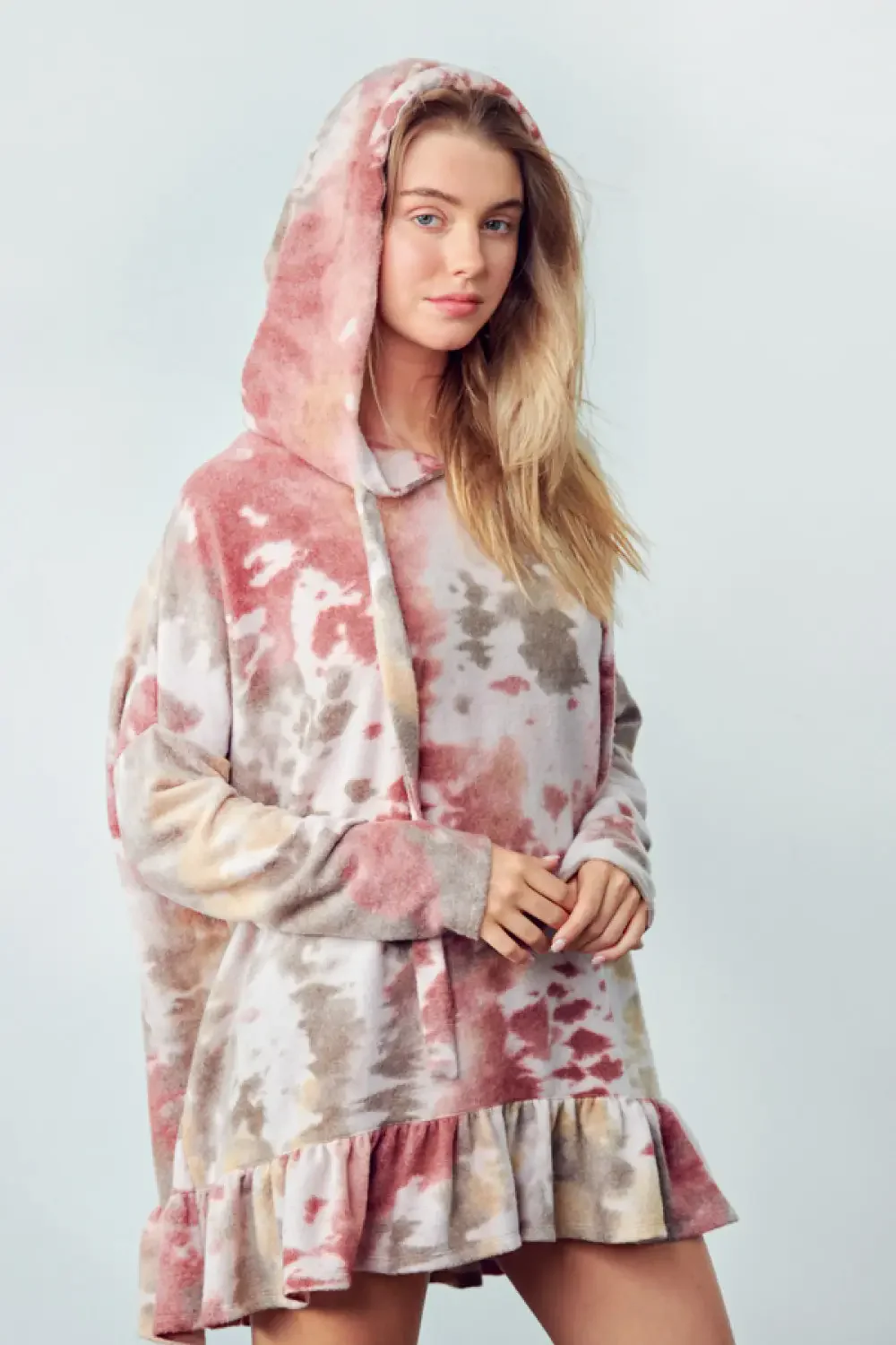 Plus Size Fluffy Tie Dye Hoodie with Ruffled Hem Loungewear Tunic